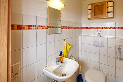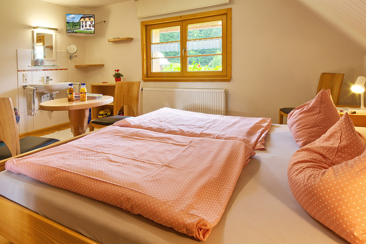 In unserer geräumigen Ferienwohnung stehen zwei Schlafzimmer zur Verfügung. Eines davon ist mit Doppelbett, Couch, Tisch, Sat-TV und Waschbecken ausgestattet, das zweite Schlafzimmer mit zwei Einzelbetten, Tisch und Waschbecken.